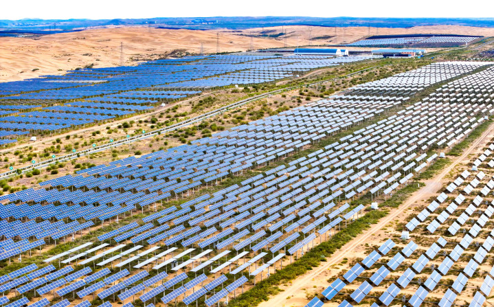 ▲上图:达拉特旗境内的鄂尔多斯“沙戈荒”中北部新能源大基地(无人机照片)。(王正/摄)