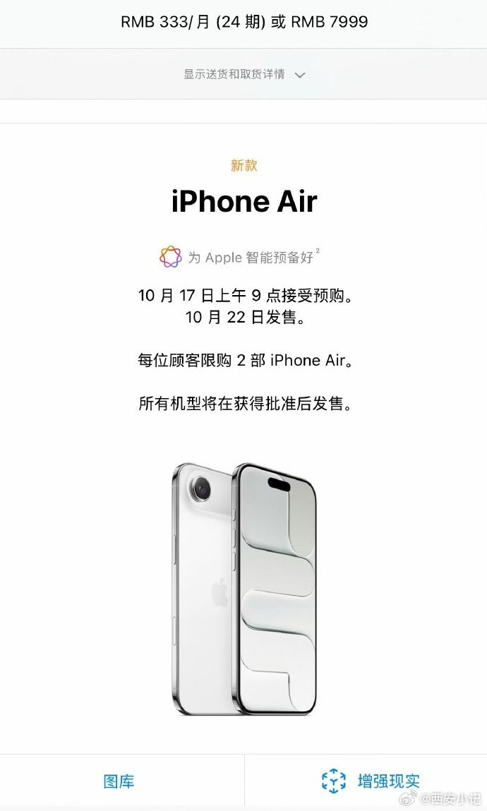 【CNMO科技消息】10月17日上午9点,苹果全新iPhone Air正式面向中国用户开放预购。CNMO了解到配资公司排名前十,预购开启后5分钟以内,官网首批iPhone Air即告售罄。目前零售店已无现货可取,送货的交付时期已推迟至一周以后。