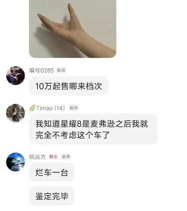 随后有网友关注到,奇瑞汽车营销公司副总经理姚飞在抖音“A9创始人版车主群”中评价吉利银河星耀8时,采用了“烂车”“二排挤得很”“音响烂”等形容词,引发网友以及吉利银河星耀8车主的吐槽。