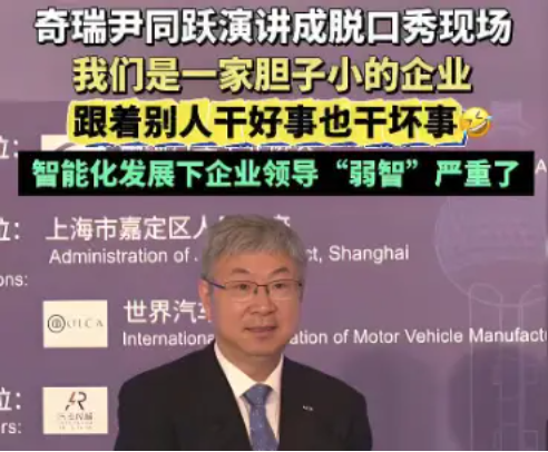在2025中国汽车论坛上,奇瑞汽车董事长尹同跃犹如一个“脱口秀演员”,在演讲中以自曝“家丑”的形式赢得喝彩。他直言奇瑞“胆子比较小,总是跟着别人干好事,也是跟着别人干坏事”。